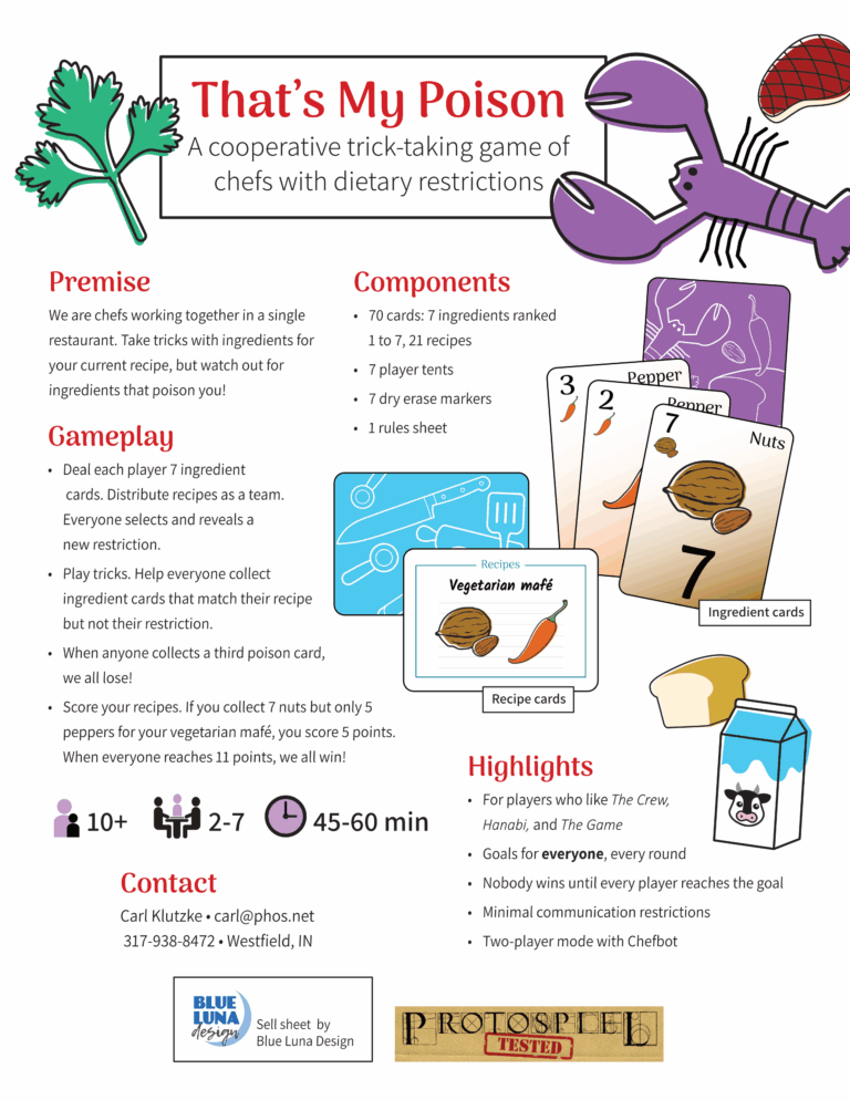 I uploaded card files to Component Studio, then exported and integrated the files at The Game Crafter for print-on-demand. I also designed the sell sheet: